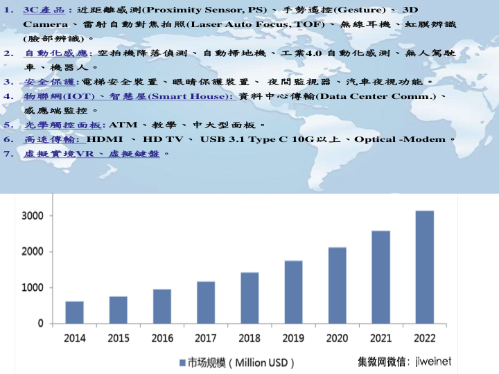 当然台湾在这方面的发展已经非常成熟,也得到国际大厂的认可,上游方面,全新、联亚与光环科技都积淀了十五年的外延与芯片技术,LED大厂晶电也早做了布局,专注芯片制造的稳懋更是砷化镓芯片最专业的代工厂,VCSEL制程对稳懋来说也非难事,除了拿到苹果3D sensor供应链Lumentum的代工订单,近期也得到3D成像模组大厂Heptagon(AMS)的VCSEL芯片代工订单,另外一家砷化镓六寸晶圆厂宏捷科也是Princeton Optronics的代工厂家。中游的封装方面,台湾累积了长久的精密封装实力,目前联钧、华信、华星、光环、矽品与同欣都是有实力可以达到世界大厂要求的封装技术,最后介绍一家坚持15年的专注VCSEL技术与产品的公司华立捷,这家公司具有上中下游垂直整合的实力,也是目前在VCSEL模组可以跟国际大厂竞争的公司。
