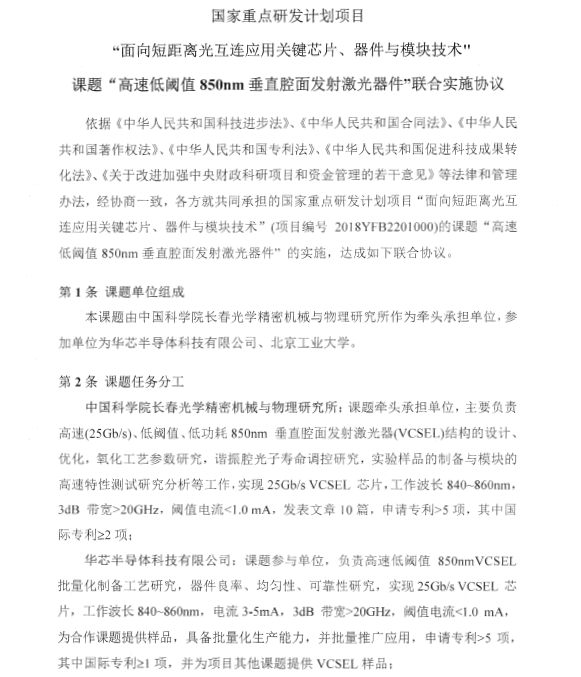近日从国家科技部网站上获悉,我公司和中国科学院长春光学精密机械与物理研究所、北京工业大学联合申报的国家重点研发计划项目“面向短距离光互连应用关键芯片、器件与模块技术”获国家科技部立项。我公司主要承担高速25Gb/sVCSEL芯片的批量化制备工艺研究、器件良率、均匀性、可靠性研究,实现批量推广应用,并未项目其他课题提供VCSEL样品。此项目为公司和科研院所合作的初次尝试,为公司后续产品的研发提供了有效的经验。